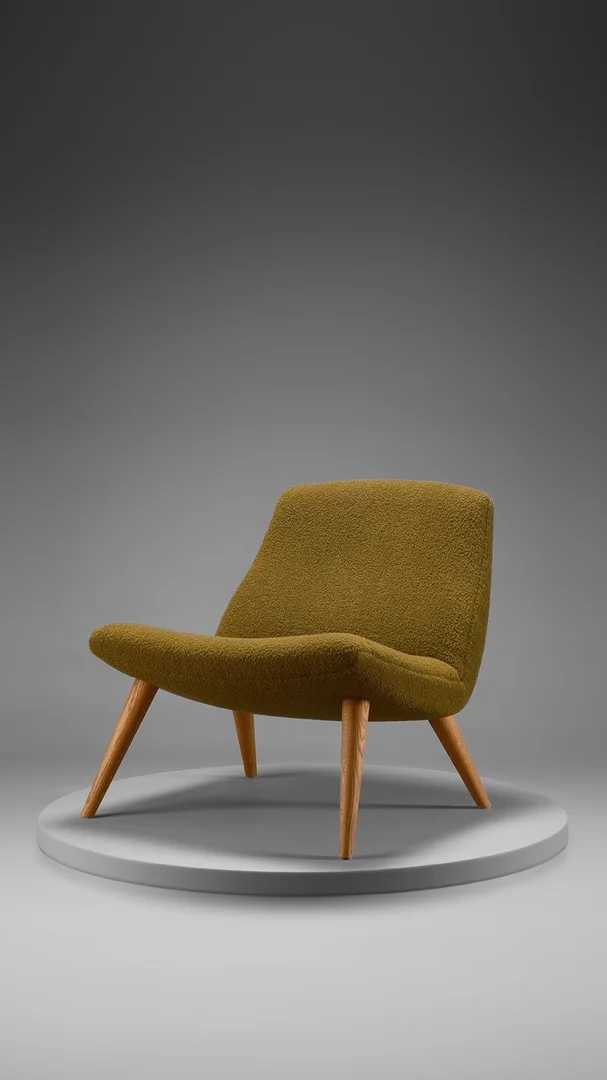 Grundlage war ein Sessel aus den 1960er-Jahren – die Umsetzung ist ein eigenständiges Werk. Der Korpus wurde vollständig neu aus hochwertigem Multiplex konstruiert, in der Gesamtgröße um 20 Prozent erweitert und mit einer bewusst breiteren Sitzfläche versehen. Sitzwinkel und Sitzhöhe wurden individuell auf den Kunden abgestimmt. Für die Füllung kommen ausschließlich hochwertige Kaltschäume zum Einsatz, die dauerhaften Sitzkomfort und formstabile Elastizität garantieren. Als Bezugsstoff wurde Kvadrat Art Baru in Kaki gewählt – ein strukturierter Bouclé mit warmem Olivton und meisterhafter Webqualität, der den erdig-eleganten Charakter des Sessels perfekt unterstreicht. Die massiven Eichenbeine, konisch gedrechselt und naturgeölt, setzen einen starken handwerklichen Akzent.